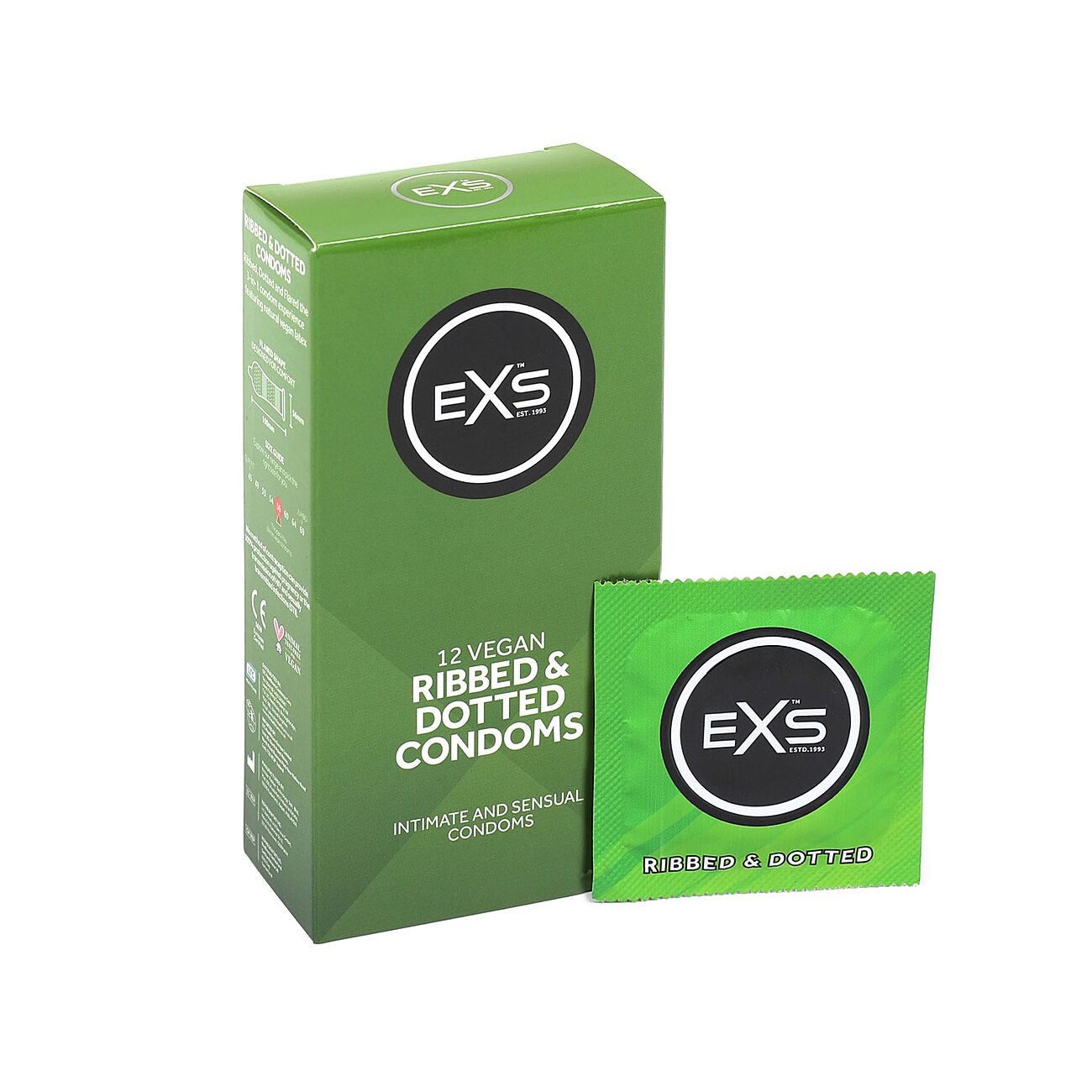 Anatomisesti muotoiltu, tyvestään kapeampi kondomi antaa terskalle tilaa ja erektiolle lisää kestoa. Laadukkaat ja varmat EXS-kondomit ovat lateksista valmistettuja, säiliöllisiä kondomeja, jotka on esiliukastettu silikonipohjaisella liukasteella ja testattu elektronisesti.