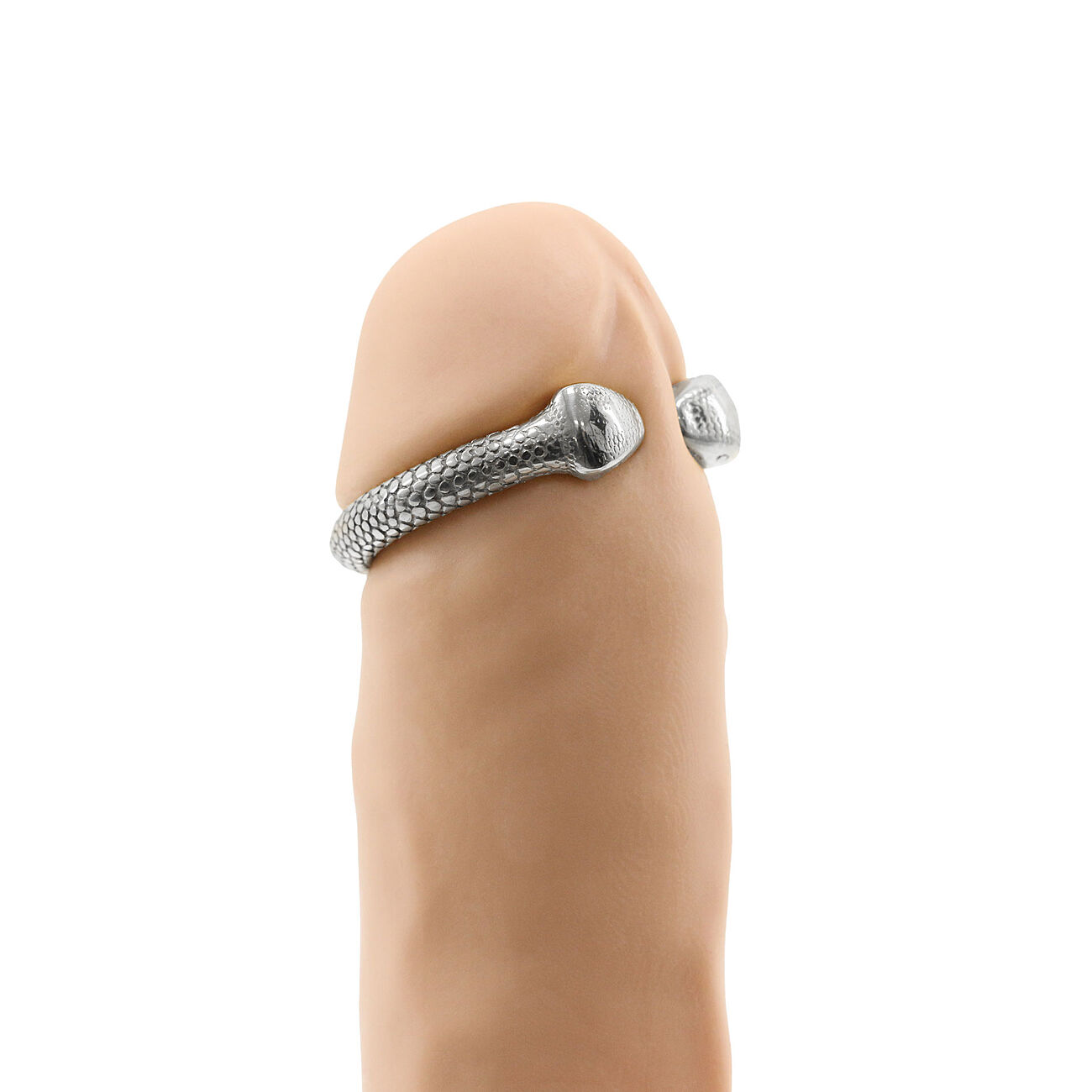 Upea hopeanvärinen Kiotoksen metallinen terskarengas imitoi ulkonäöltään käärmettä. Avonainen kaksipäinen käärme terskarengas on tyylikäs koriste terskan juuressa ja se saa penetraationkin maistumaan kiihottavammalta!