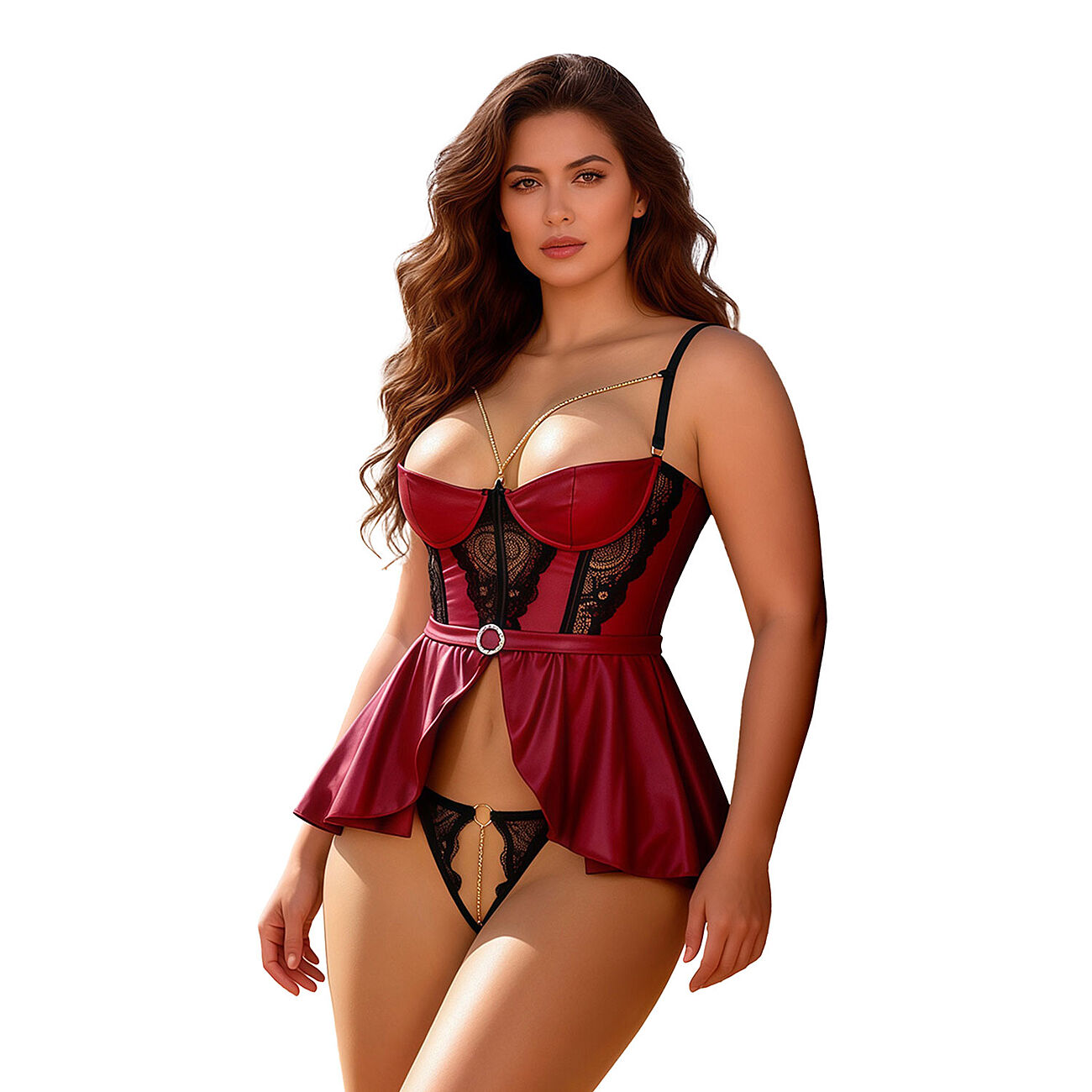 OhYeah-brändin Plus Size-kokoinen viininpunaisen ja mustan väriyhdistelmä toteutuu kauniilla tavalla tässä ilmavaa keinonahkaa olevassa babydoll-asussa. Tämä eroottinen alusasu on täydellinen valinta, kun haluat tarjota vartalollesi jotakin seksikästä sekä naisellista. Musta pitsi tuo kokonaisuuteen klassista eleganssia. Hienostuneet kultaketjut luovat rohkean ja näyttävän kontrastin syvään viininpunaiseen sävyyn - lopputulos on ylellinen ja lumoava.