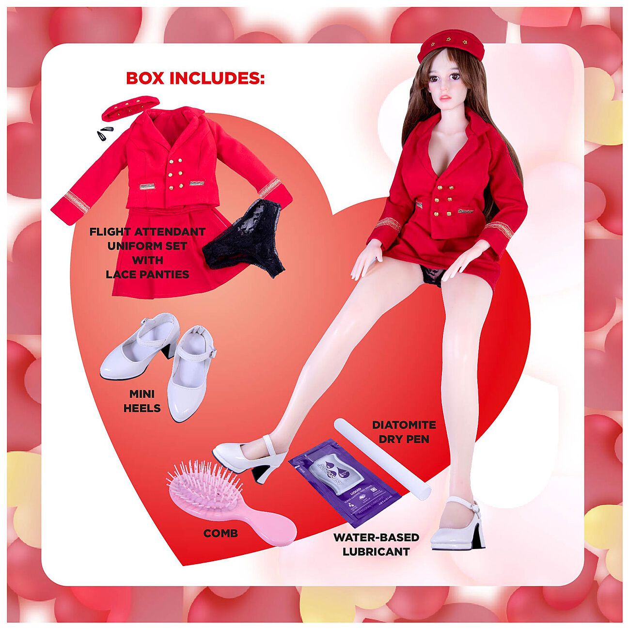 Pakkaus sisältää kauniin punaisen lentoemon työasun, johon kuuluu suikka, takki, hame, mustat pitsiset alushousut sekä valkoiset tolppakorkokengät. Pakkauksessa on lisäksi peruukki, hiusharja sekä diatomiittikuivakynä. Diatomiittikynä auttaa pitämään nuken pinnan parempana ja kestävämpänä pitempään, sillä kynä imee lopunkin kosteuden ja öljyn itseensä pinnasta kuivaamisen jälkeen.
