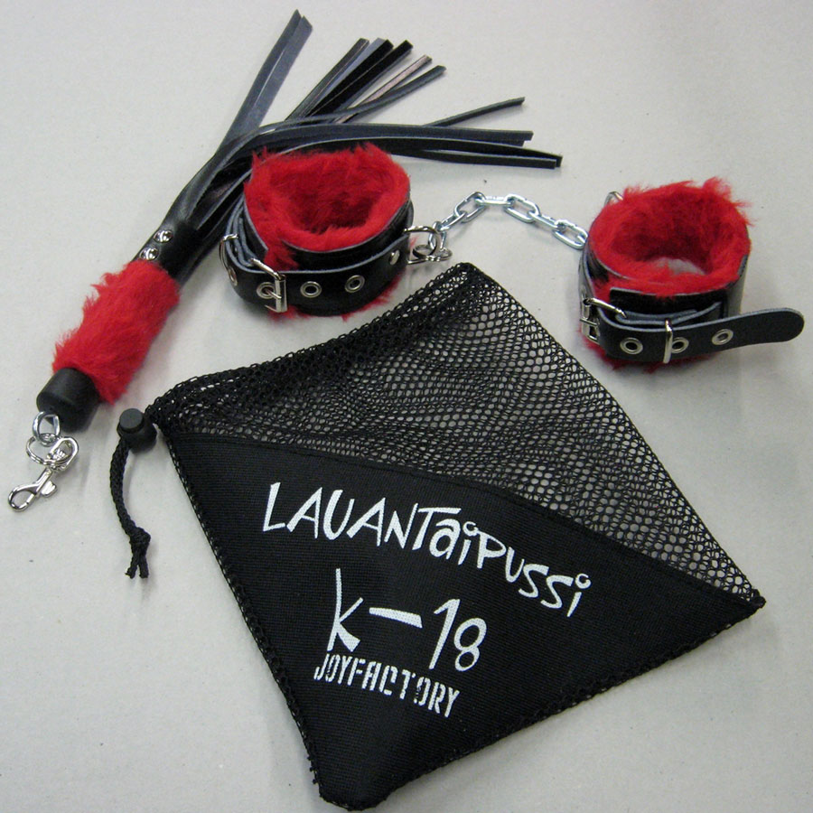 Lauantaipussissa on jämäkät käsikahleet, joissa on välissä kiihottavasti kilisevä metalliketju. Nahkasta valmistetuissa käsiraudoissa on punaiset tekokarvaiset sisukset. Käsi- nilkkakahleissa on runsaasti säätövaraa. K-18 Lauantaipussissa on myös nahkainen ruoska jolla annat kunnon kyydit kenelle tahansa. Ruoskassa on tekokarvapäällysteinen kahva.
