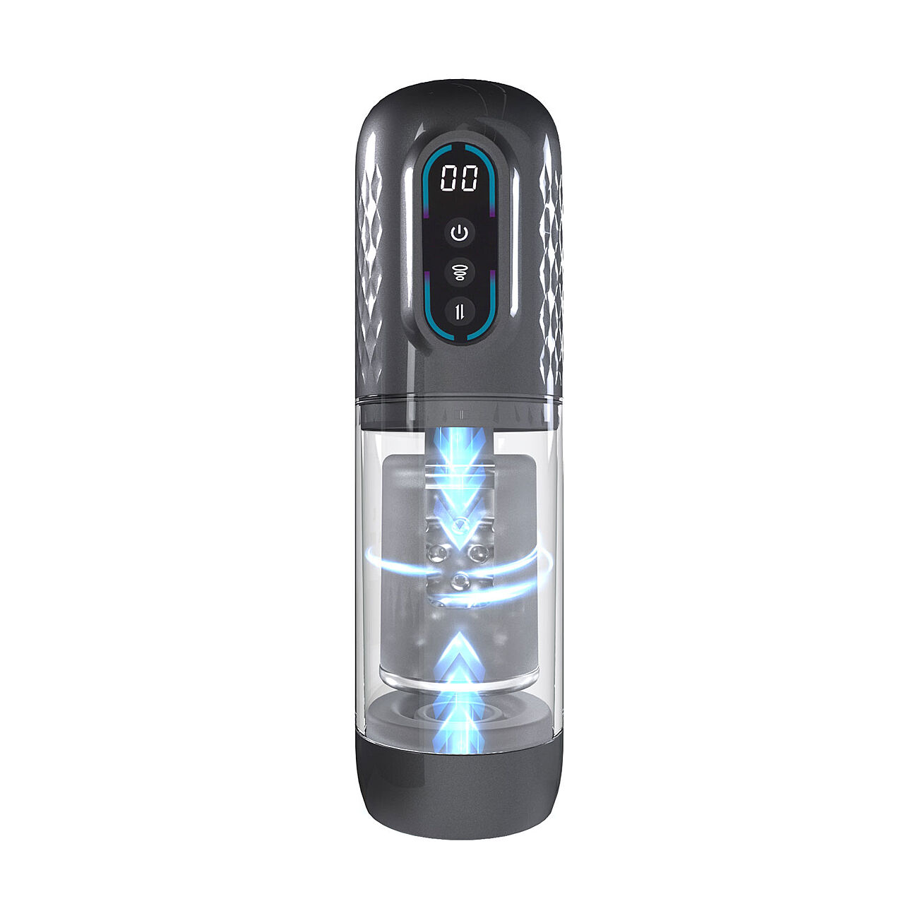 Masturbaattorin kirkas sylinteri tekee kokemuksesta myös visuaalisesti kiinnostavan. Läpinäkyvän rakenteen ansiosta voit nähdä peniksen liikkeet laitteen sisällä ja seurata, miten alipaine ja pyörivä liike vaikuttavat stimulaatioon.